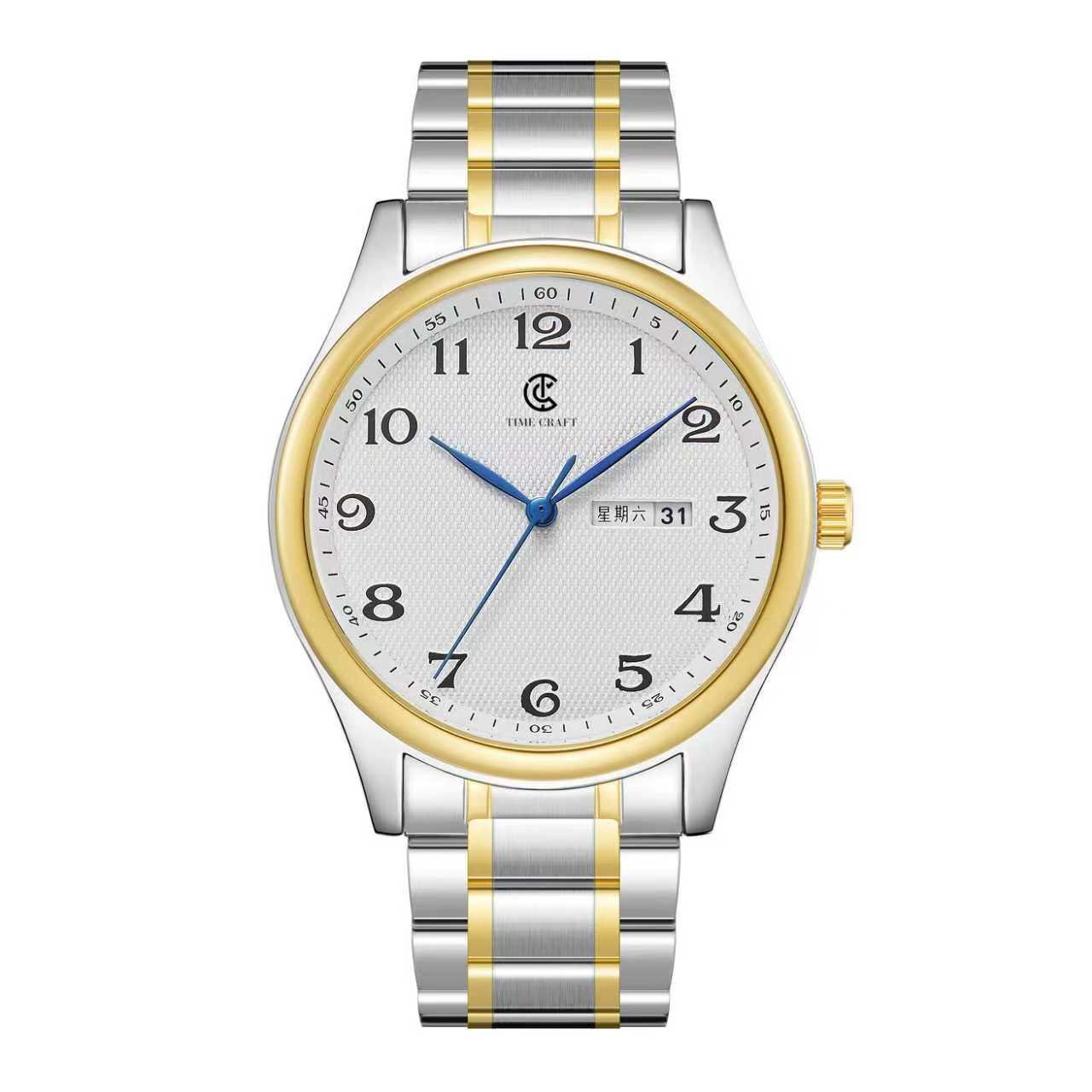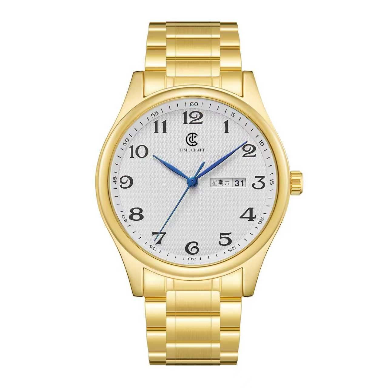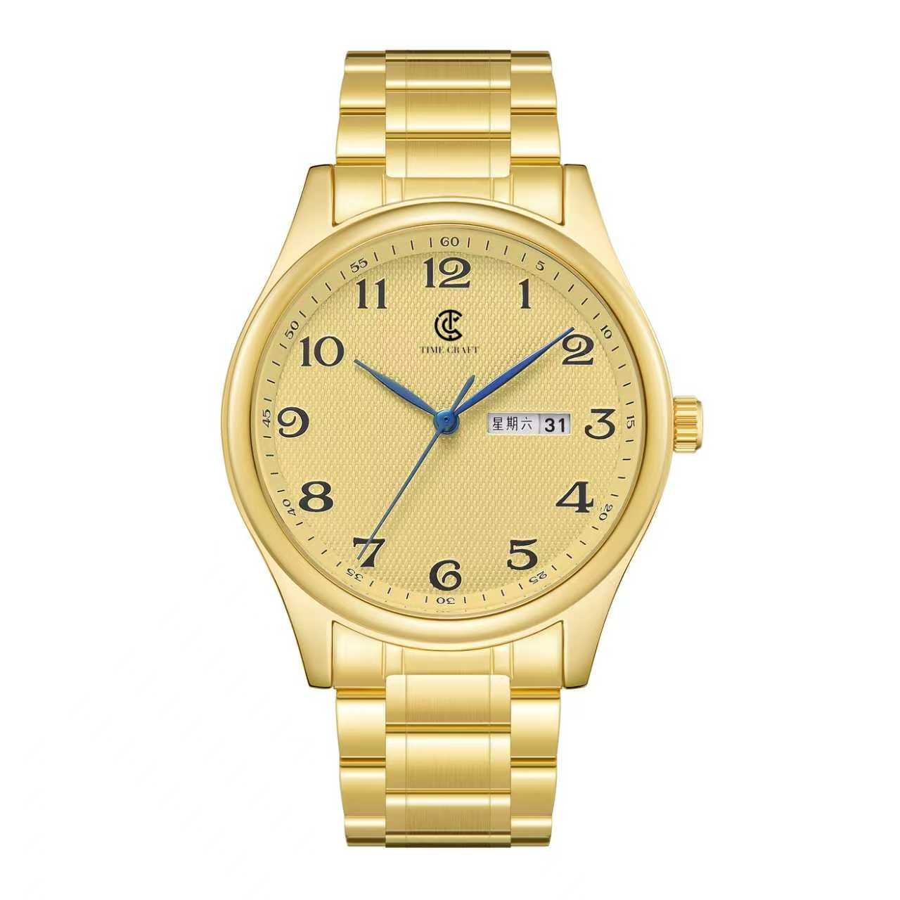 The Time Craft Classic Gold Day-Date Watch offers a timeless and elegant design perfect for everyday sophistication. Its gold stainless steel strap and case deliver a premium luxury look, while the white textured dial with blue hands adds a refined and stylish touch.