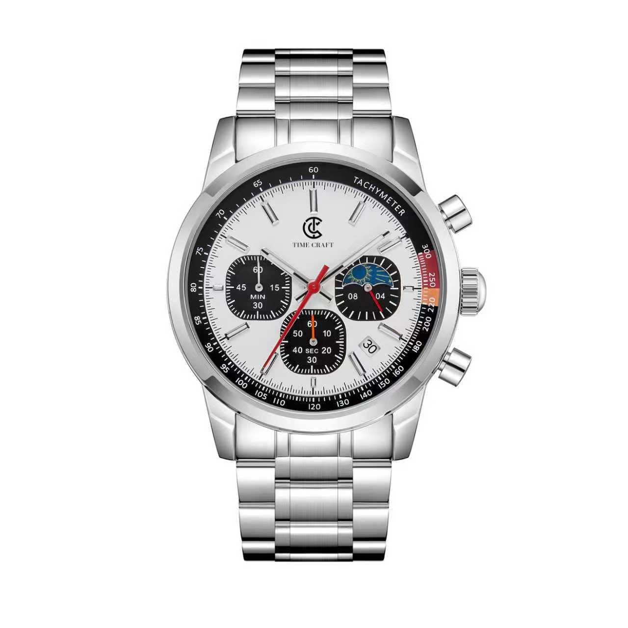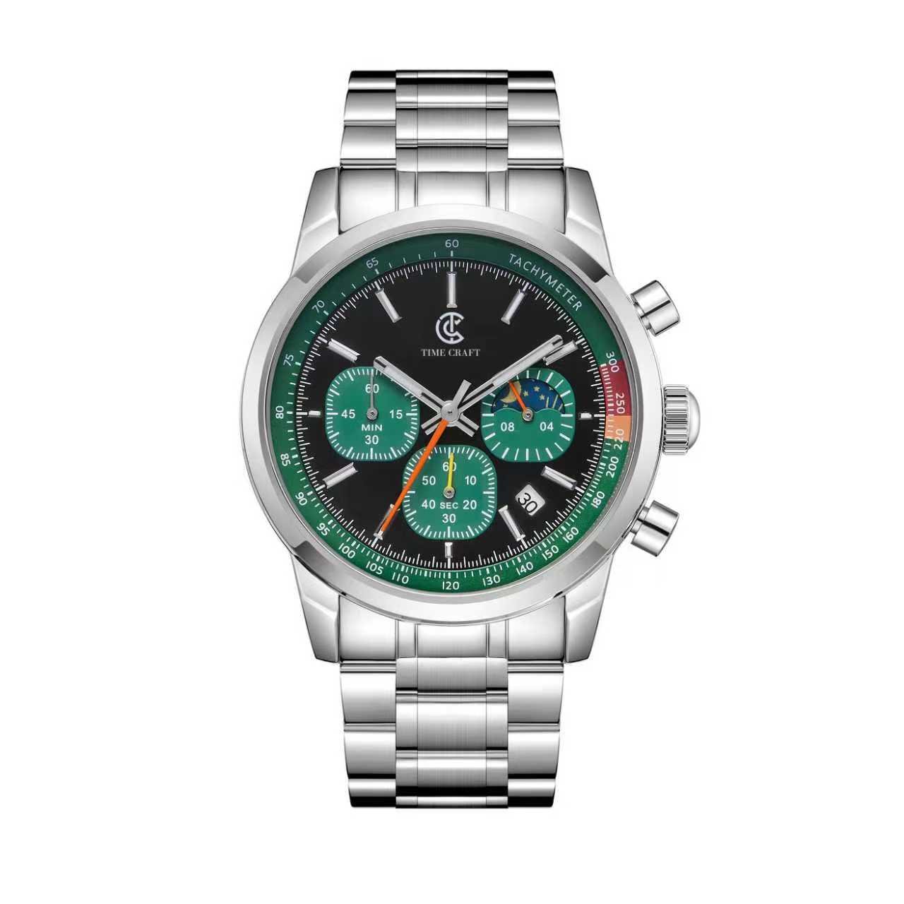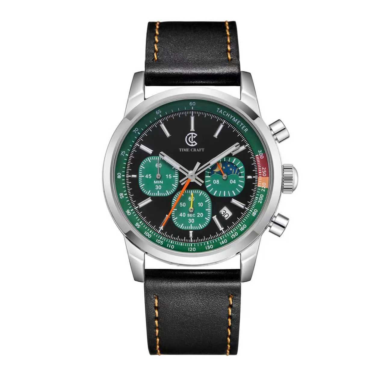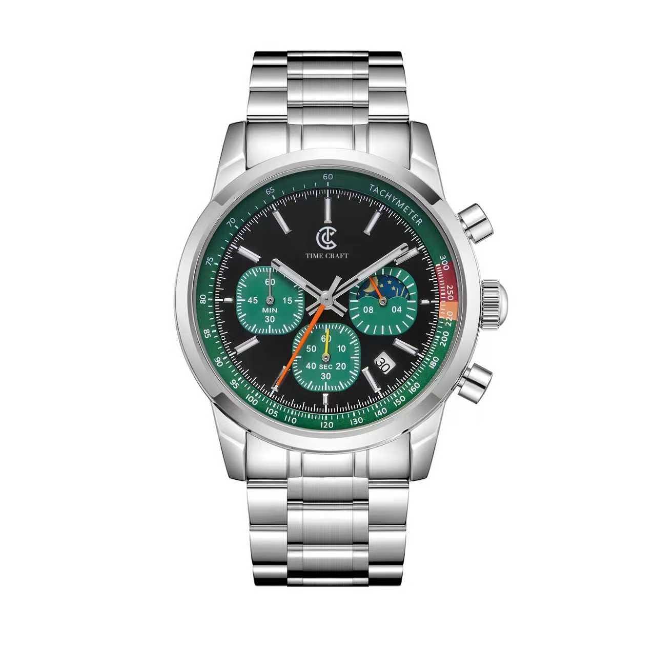 This watch includes chronograph sub-dials, date display, and quartz movement for accurate timekeeping and modern functionality. The tachymeter bezel and red second hand enhance its sporty yet classic appearance.